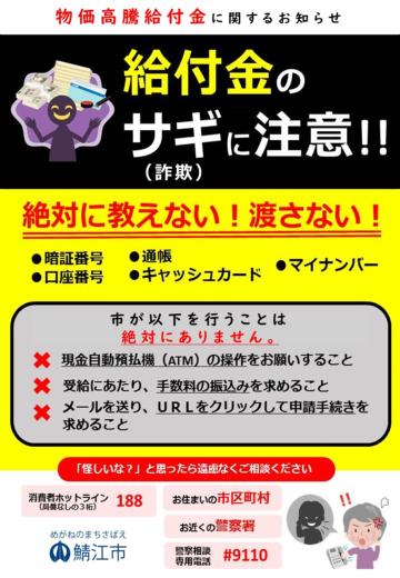 ・給付等を語った不審な電話やメール等があった場合には、各給付金事業の市担当課のお問い合わせ先、最寄りの警察署、警察相談専用電話(☎#9110)または消費者ホットライン(☎188)までご連絡ください。