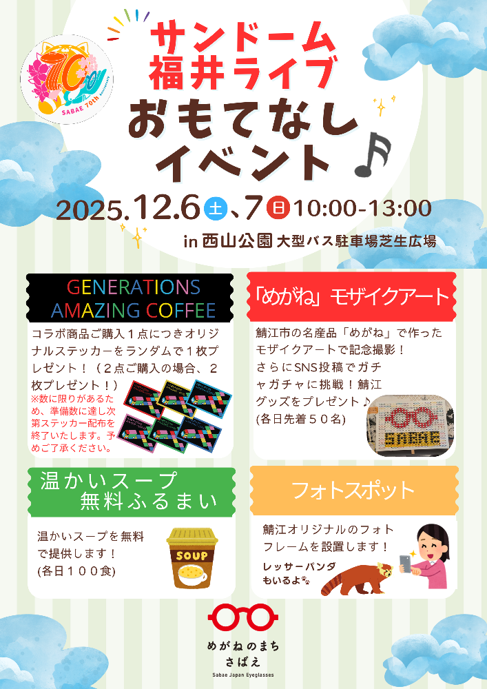 当日は「GENERATIONS AMAZING COFFEE」にてコラボ商品ご購入でオリジナルステッカーをプレゼント! また、「めがねモザイクアート」の写真をSNSに投稿で鯖江オリジナルグッズのプレゼント!さらに温かいスープを無料で提供します。