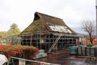 前回の屋根葺替えから30年以上が経過しており、屋根(茅葺・下屋柿葺)の傷みが著しい状況です。また、不同沈下に起因する建物基礎への影響により軸部の不陸と傾斜が発生しているほか、造作部・壁・柱・建具などが変形や破損を起こし、柱の傾斜等も確認されています。