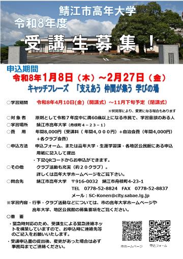 鯖江市高年大学 令和8年度受講申込期間は 令和8年1月8日(木曜日)~ 2月27日(金曜日)です。