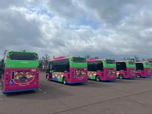 利用者の皆様の乗車快適性向上のため、つつじバス(レッサーパンダ柄)全7台のうち5台の車両の更新を行います。