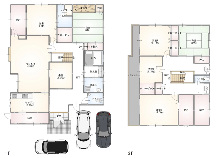 間取り(1階) | 居間(18畳)、洋室(8.5畳)、和室(8畳)、書斎(5.3畳)、台所、風呂、トイレ |