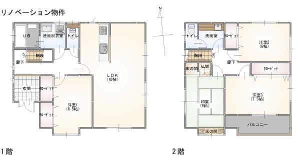 | 間取り(1階) | LDK(18畳)、洋室(6.5畳)、風呂、トイレ、クローゼット |
