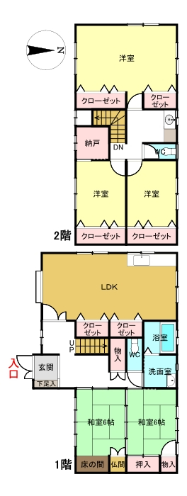 | 間取り(1階) | LDK、和室×2、トイレ、洗面室、浴室、クローゼット、押し入れ、仏間、床の間 |
